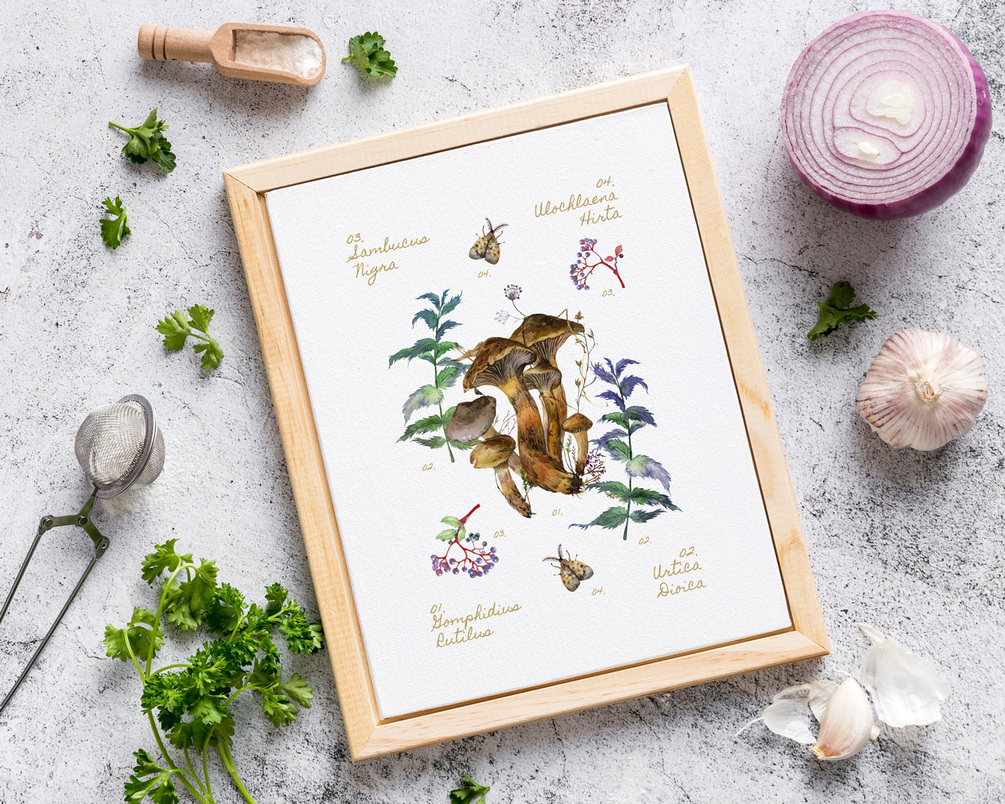 I have designed this illustrations that can be used in many ways, printed for the decoration of your room, kitchen or for educational purposes in a space dedicated to learn or just for promoting the love and appreciation of nature, forest and earth. These prints are not limited here, they can be used from foraging events, species identification workshops, mushroom photography tours, creating foraged drinks and products. No matter what you want to do, its all yours.